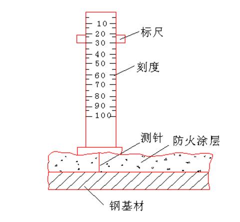 三、测试时,将测厚探针垂直插入防火涂层直到钢基材表面上,记录标尺读数