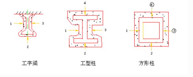 全钢框架结构的梁和柱的防火涂层厚度测定,在构件长度内每隔3m取一截面,按附图4.2所示位置测试。